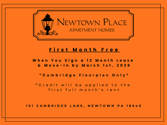 Discover Newtown Place apartments in Newtown, PA! Known as one of the best places to live in Pennsylvania, this Philadelphia suburb is located in desirable Bucks County. Just 0.7 miles from SEPTA's Newtown Station, our apartments offer access to the city. You can't beat Newtown Place's location when it comes to its proximity to the main commercial thoroughfare of Newtown. Step out of your front door and many restaurants, bars, and shops are all a 10-minute walk or a short drive away. Residents enjoy nearby community parks like Carl Sedia Park and Linton Memorial Park. The public schools in Newtown, PA are highly rated, and the town also hosts the Bucks County Community College. Nearby hospitals include St. Mary Medical Center and Jefferson Bucks Hospital.